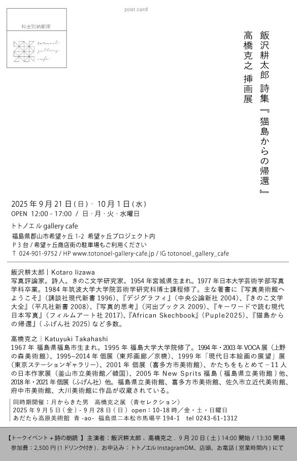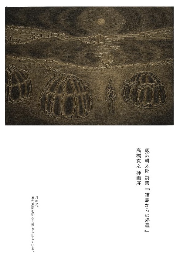 ふげん社より刊行(2025年)された飯沢耕太郎詩集『猫島からの帰還』は、著者の東アフリカ滞在の記憶をもとに、現実とも幻想ともつかない“猫島”を旅する連作詩によるお話しです。合成漆をマチエールとした高橋克之の挿画が、迷宮のような旅路を浮かび上がらせ、不思議な世界へ誘います。詩とともに原画9点を展示致します